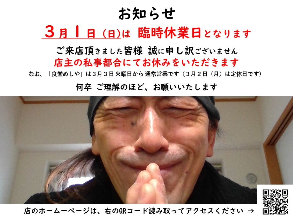「2月7日(土)と 2月8日(日)」は、『臨時休業』 です 私事及び家族都合にてお休みをいただきます、ご来店計画中の皆様には誠に申し訳ございません 何卒ご理解のほど、ご容赦願います m(__)m なお、「食堂めしや」は、2月10日 火...
