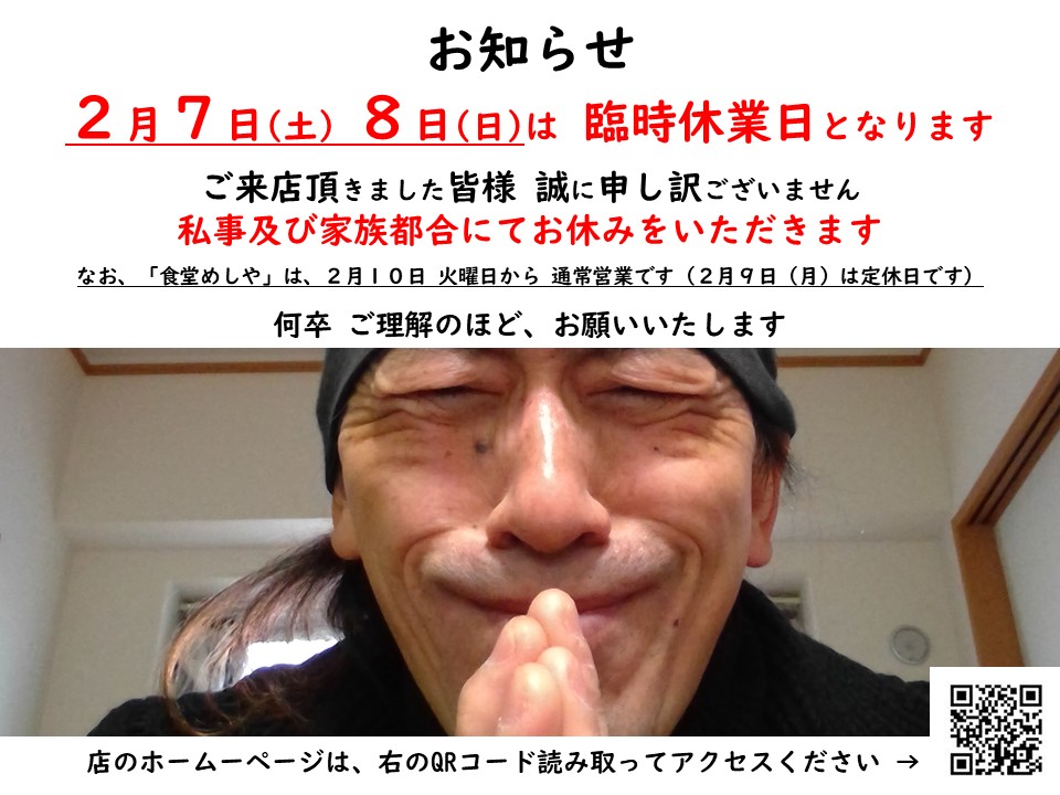 なお、「食堂めしや」は、2月10日 火曜日から 通常営業です(2月9日(月)は定休日です)